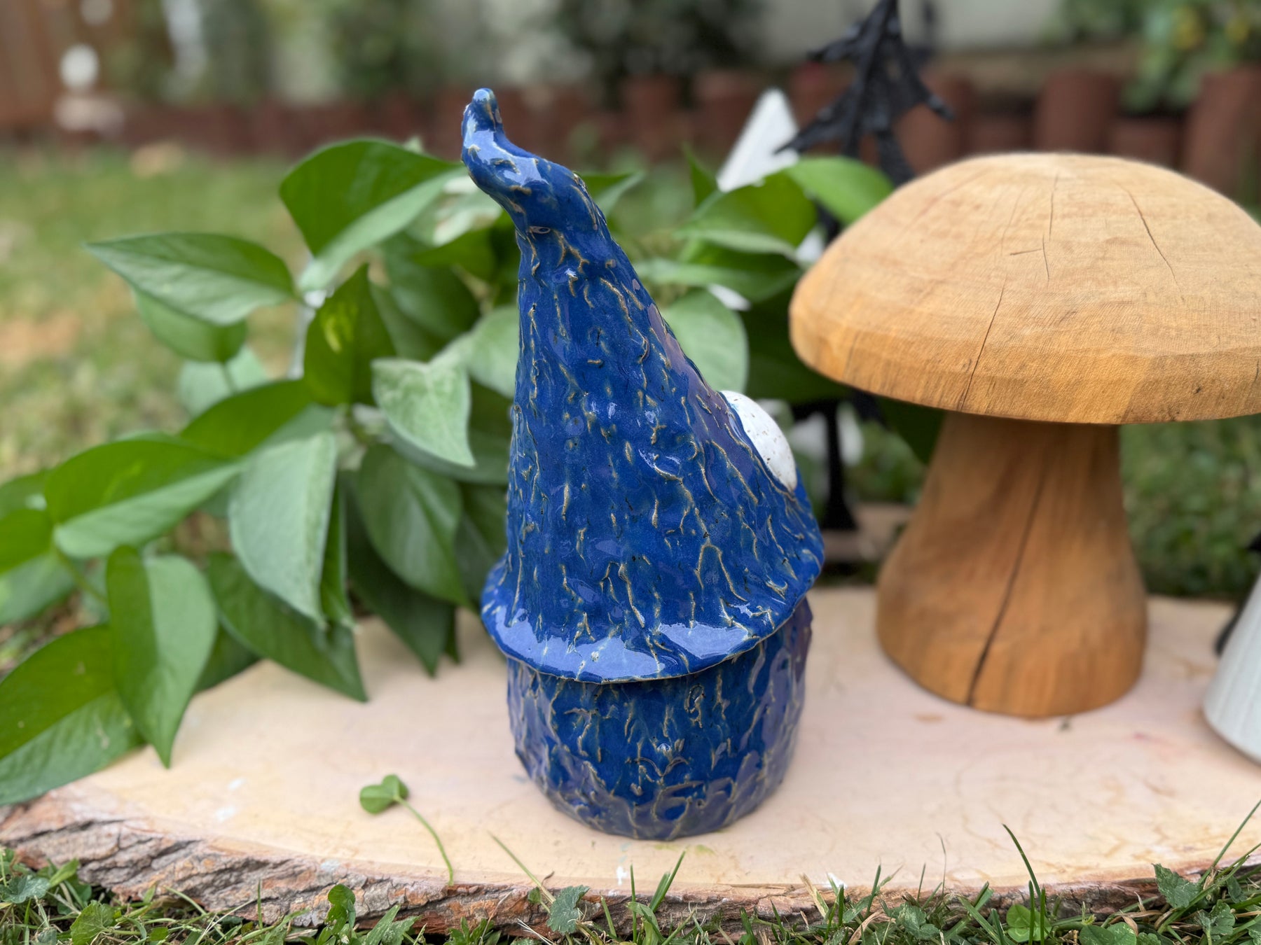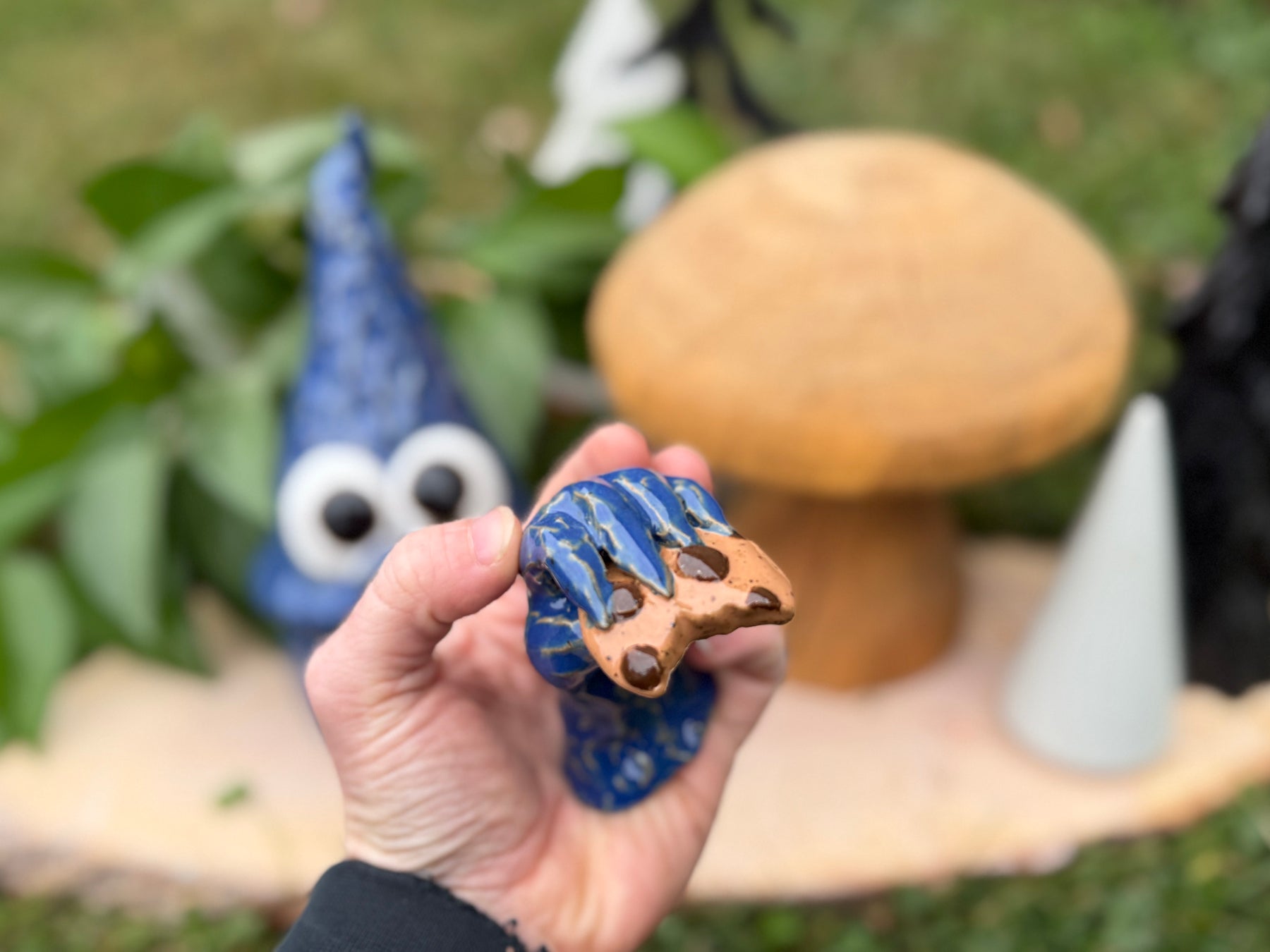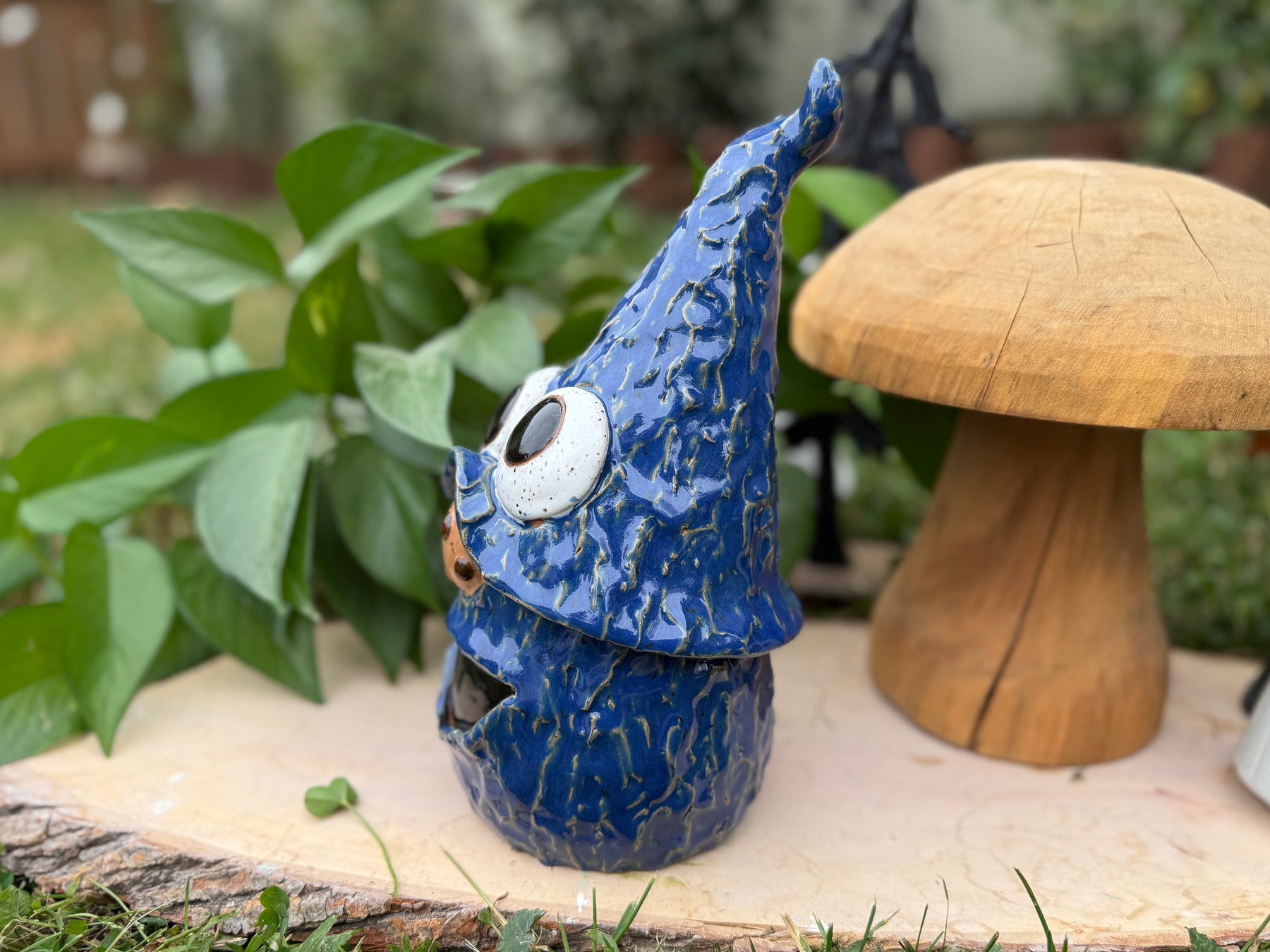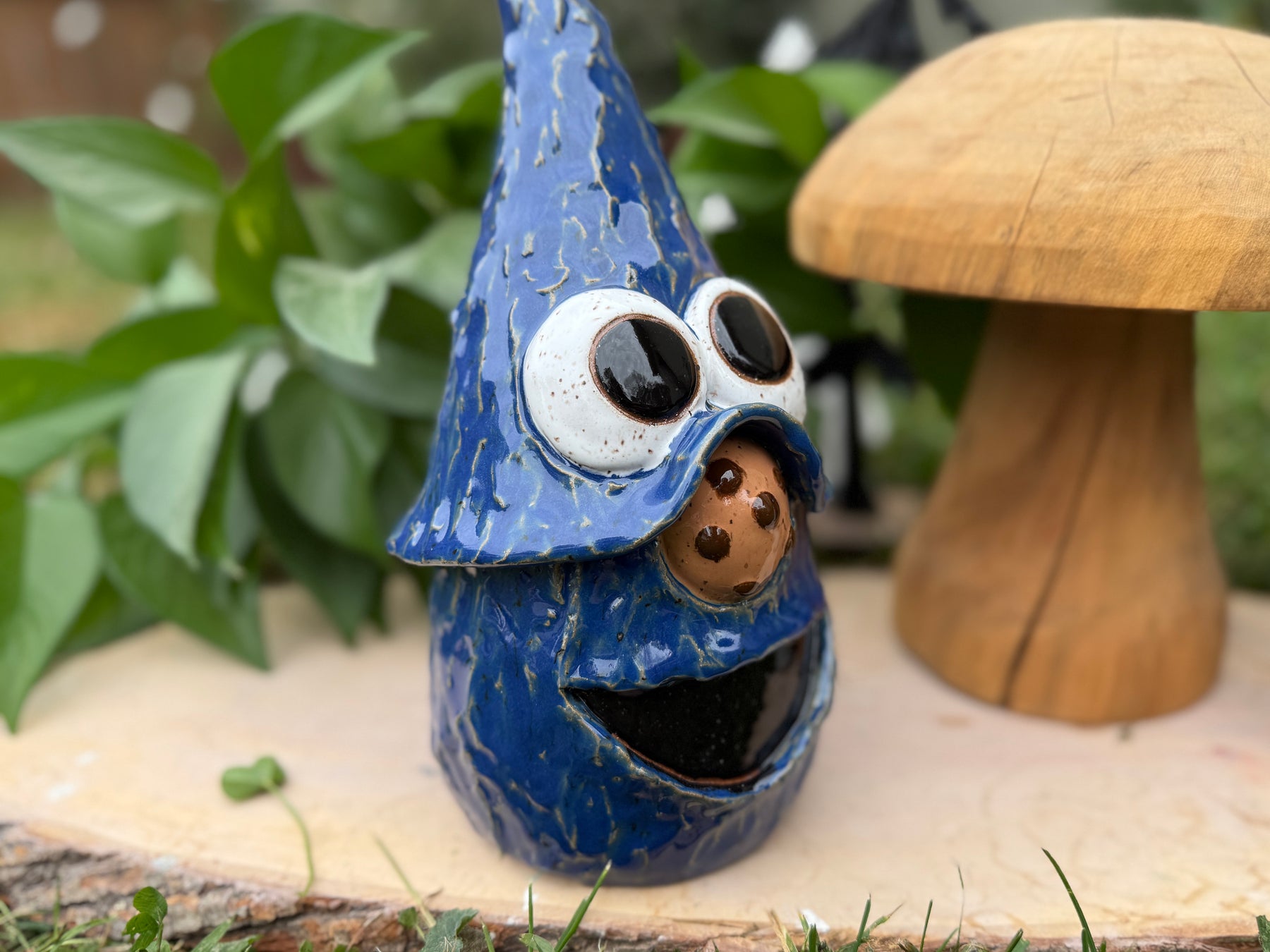 This gnome statue is the perfect gift for any lover of monsters, of whimsy and of unique handmade items. The gnome is thrown on the wheel in two parts, then manipulated, so it is completely hollow with a small ventilation hole on the bottom. It is fully glazed so it is technically safe to be outside - though I do recommend bringing it inside during any kind of extreme weather (freezes, high winds, etc). This gnome also comes with a detached hand holding a cookie, which is just a whimsical addition to the theme :-)