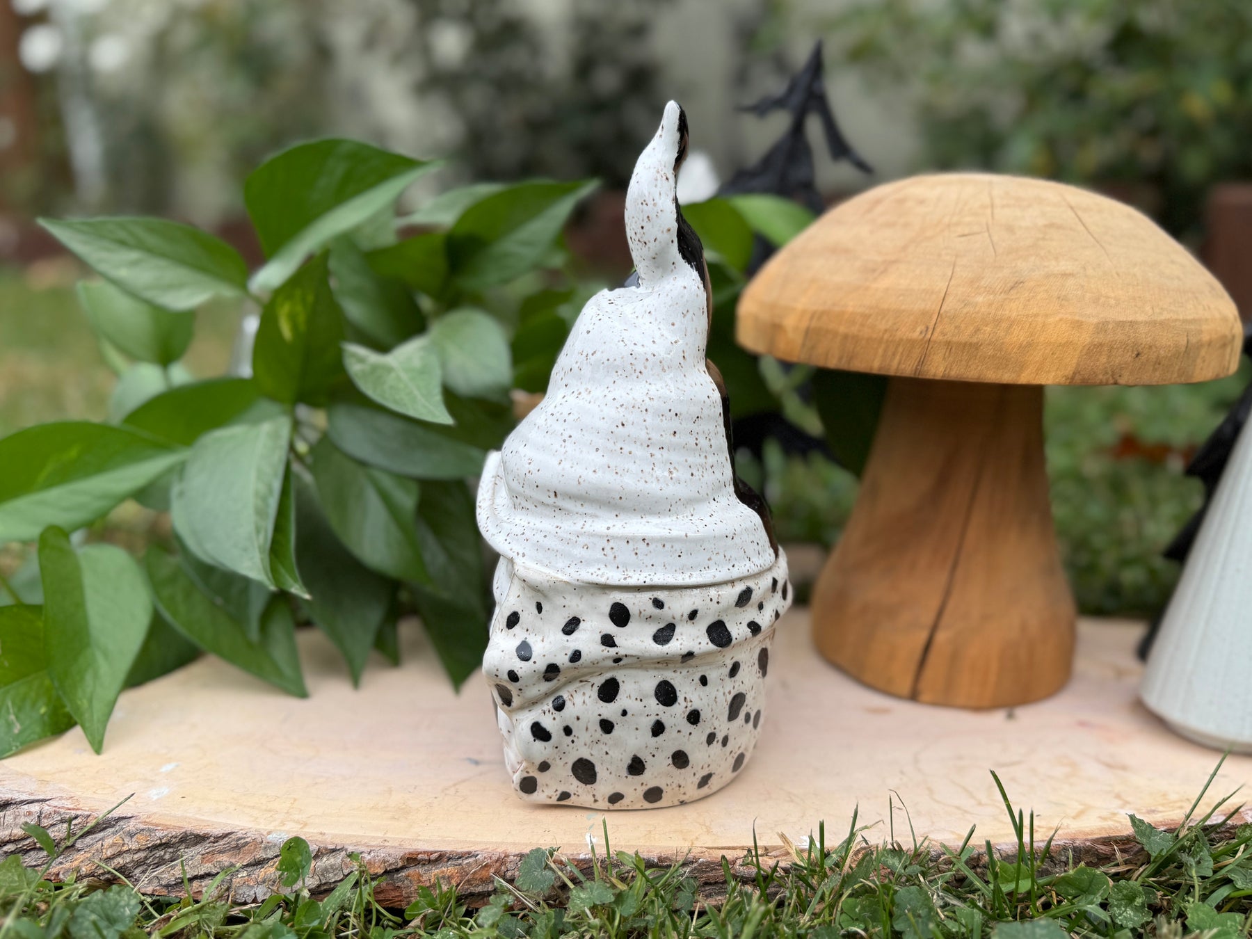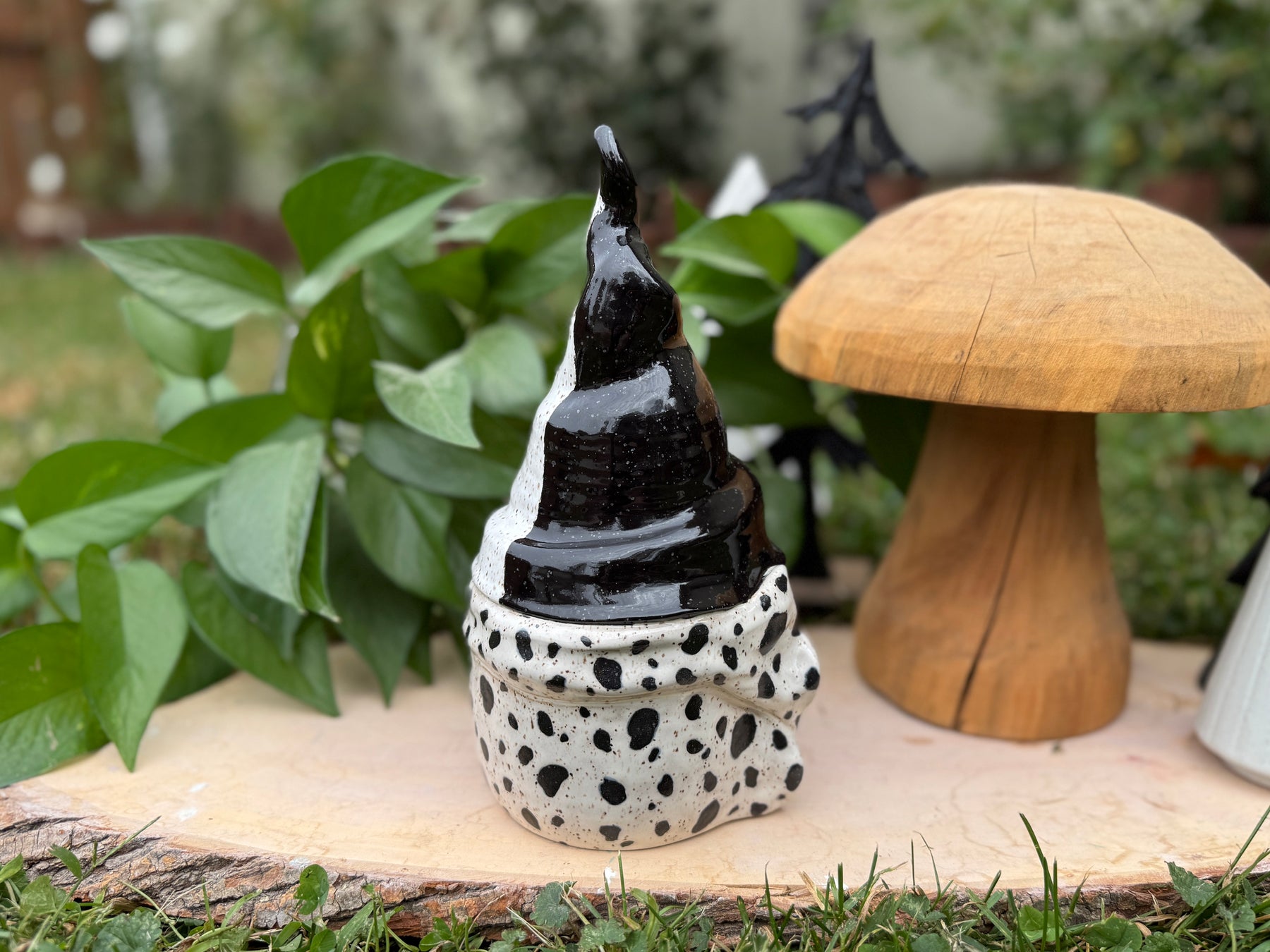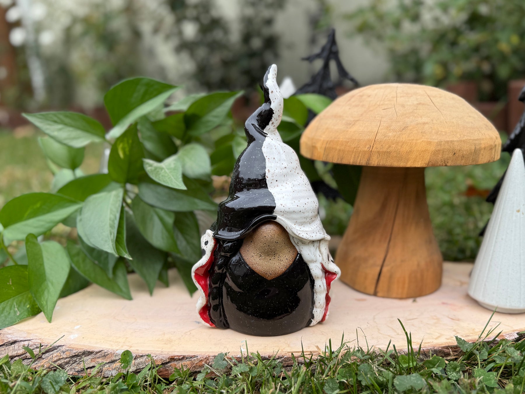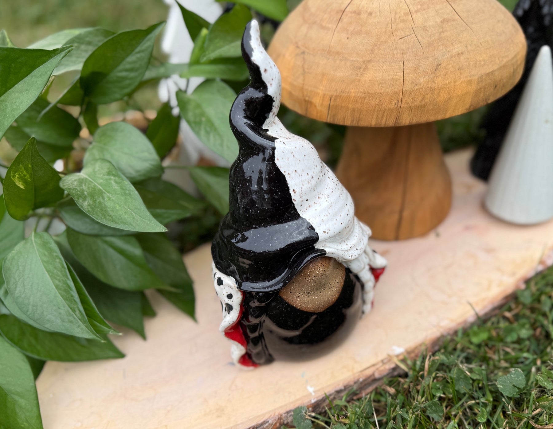 This gnome statue is the perfect gift for any lover of villains, of whimsy and of unique handmade items. The gnome is thrown on the wheel in two parts, then manipulated, so it is completely hollow with a small ventilation hole on the bottom. It is fully glazed so it is technically safe to be outside - though I do recommend bringing it inside during any kind of extreme weather (freezes, high winds, etc).