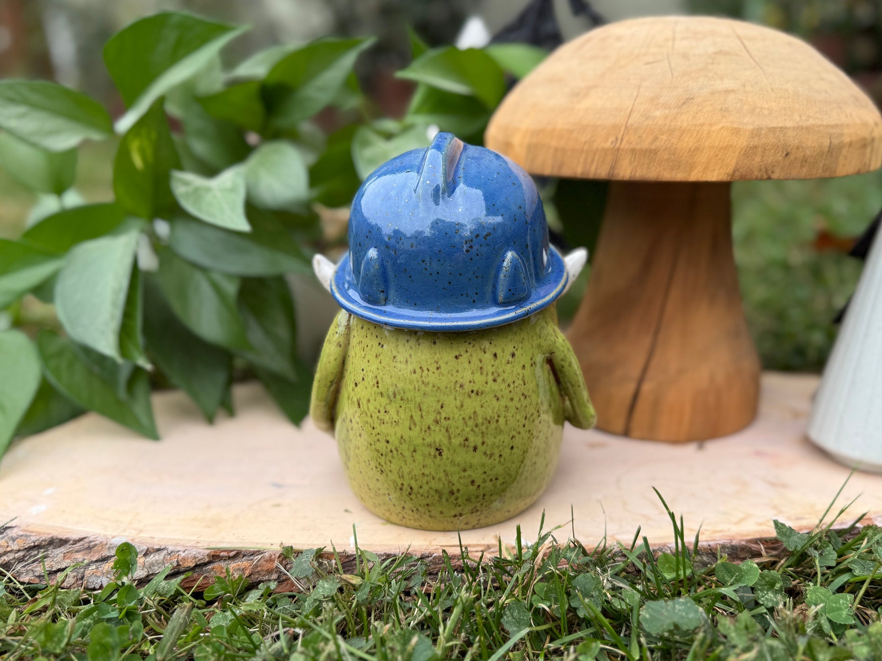 This gnome statue is the perfect gift for any lover of monsters, of whimsy and of unique handmade items. The gnome is thrown on the wheel in two parts, then manipulated, so it is completely hollow with a small ventilation hole on the bottom. The nose is exposed clay, but the rest of it is glazed so it is technically safe to be outside - though I do recommend bringing it inside during any kind of extreme weather (freezes, high winds, etc).