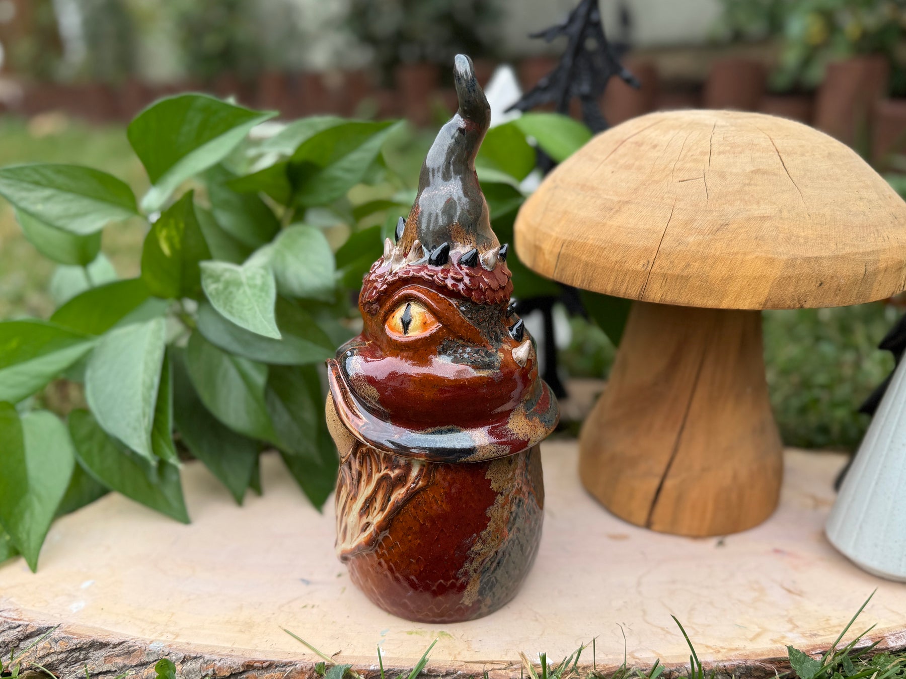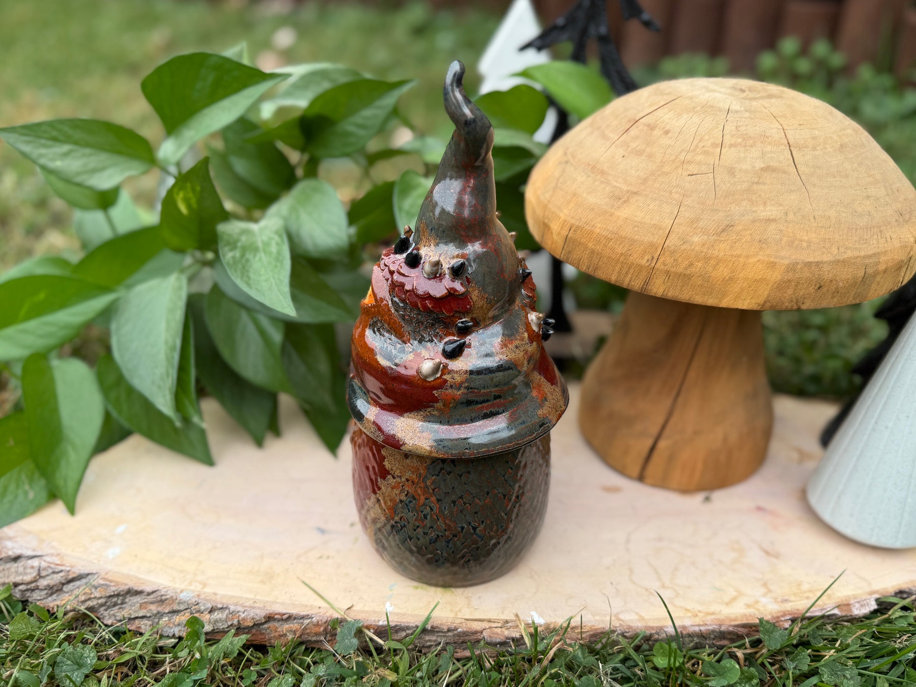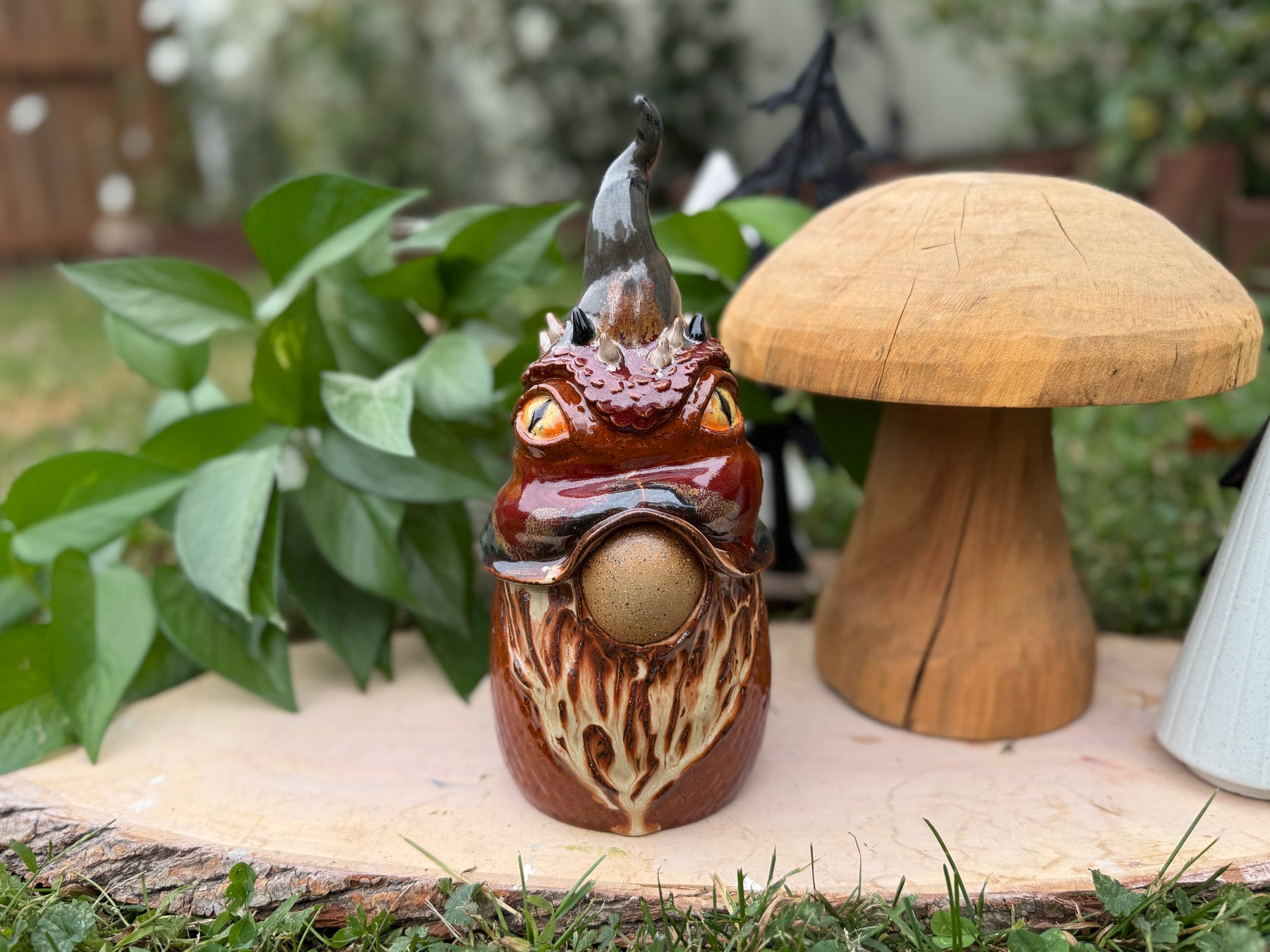 This gnome statue is the perfect gift for any lover of monsters, of whimsy and of unique handmade items. The gnome is thrown on the wheel in two parts, then manipulated, so it is completely hollow with a small ventilation hole on the bottom. It is fully glazed so it is technically safe to be outside - though I do recommend bringing it inside during any kind of extreme weather (freezes, high winds, etc).