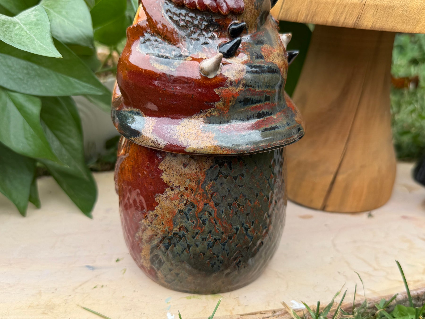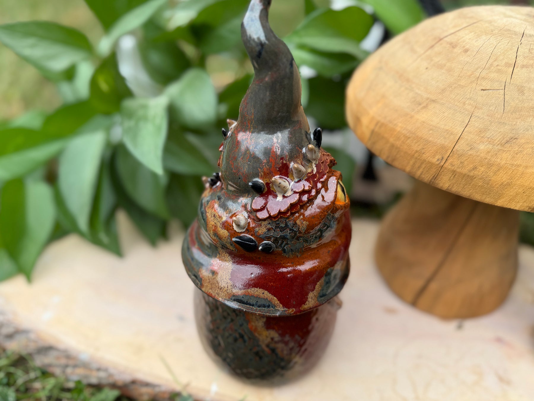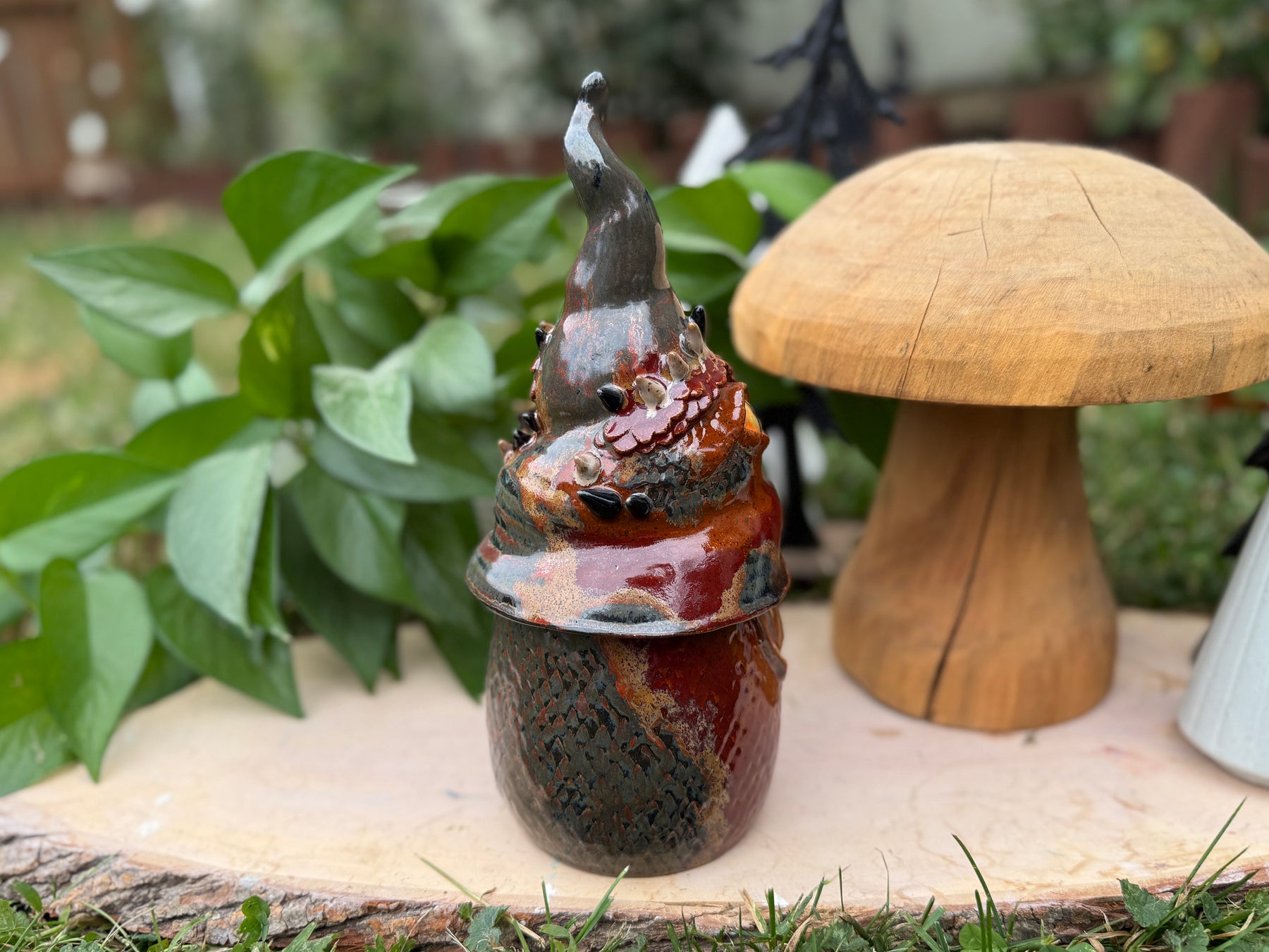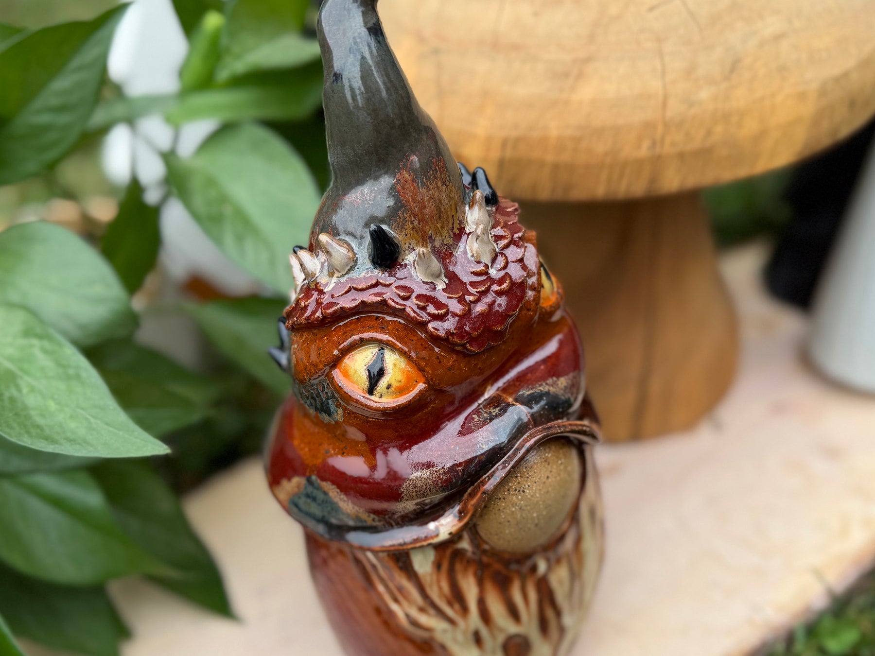 This gnome statue is the perfect gift for any lover of monsters, of whimsy and of unique handmade items. The gnome is thrown on the wheel in two parts, then manipulated, so it is completely hollow with a small ventilation hole on the bottom. It is fully glazed so it is technically safe to be outside - though I do recommend bringing it inside during any kind of extreme weather (freezes, high winds, etc).